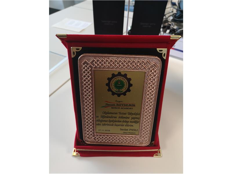 Öğrencilerin gelişimleri ve teknik açıdan iyi bir altyapıya sahip olmaları için çeşitli faaliyetler yapan Bosch Termoteknik Akademi yetkililerine, İnegöl Hacı Sevim Yıldız-2 Mesleki ve Teknik Anadolu Lisesi müdürü tarafından plaket verildi.