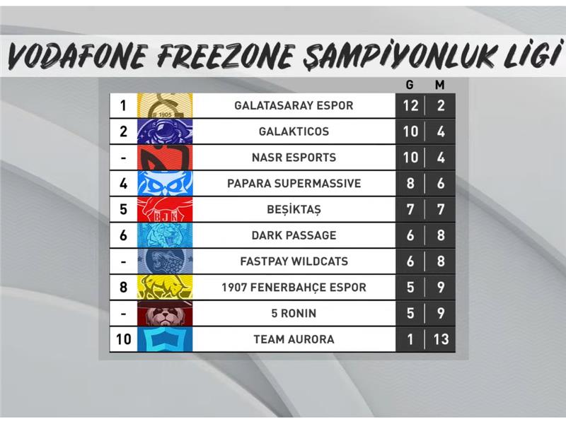 Vodafone FreeZone Şampiyonluk Ligi Yaz Mevsimi’nde lig aşamasını ilk altı sırada tamamlayan ekipler mevsim finallerine katılmaya hak kazanacak. Mevsim finallerine katılmayı büyük ölçüde garantileyen takımlar; Galatasaray Espor, Nasr Esports ve GALAKTICOS olurken kalan üç slot içinse mücadele devam ediyor.