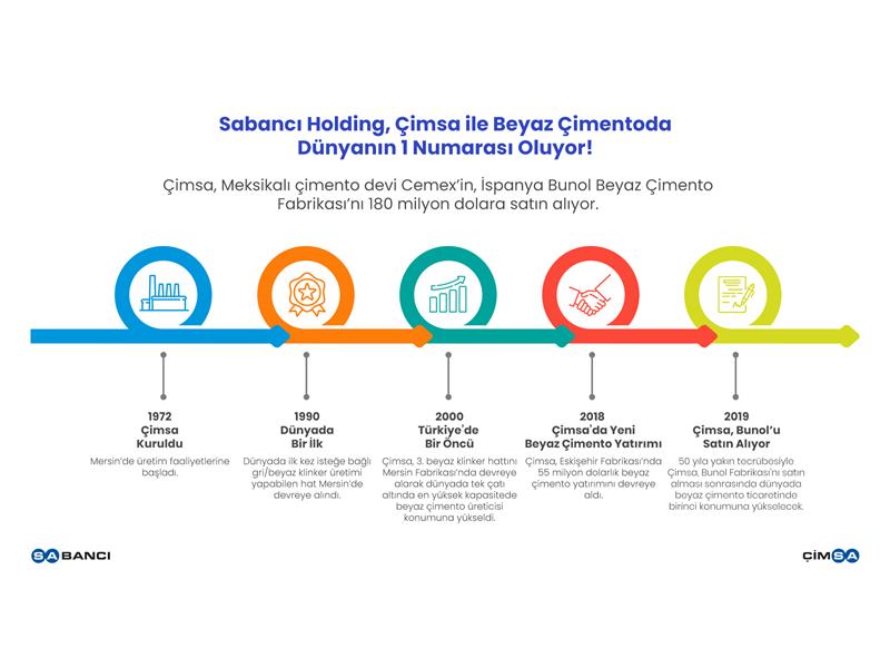 Sabancı Holding iştiraklerinden Çimsa, beyaz çimentoda dünya lideri oluyor. Dünyanın önde gelen çimento üreticilerinden Meksikalı Cemex’in İspanya’nın Valensiya şehrindeki Bunol Fabrikası’nın yaklaşık 180 milyon dolara Çimsa’ya satışı için ‘bağlayıcı anlaşma’ imzalamak üzere uzlaştı. Satışın 2019’un ikinci yarısında tamamlanması bekleniyor. Bu satın alma işlemi ile birlikte, halen beyaz çimento üretim kapasitesinde Avrupa birincisi olan Çimsa, dünya liderliğine yükselecek.