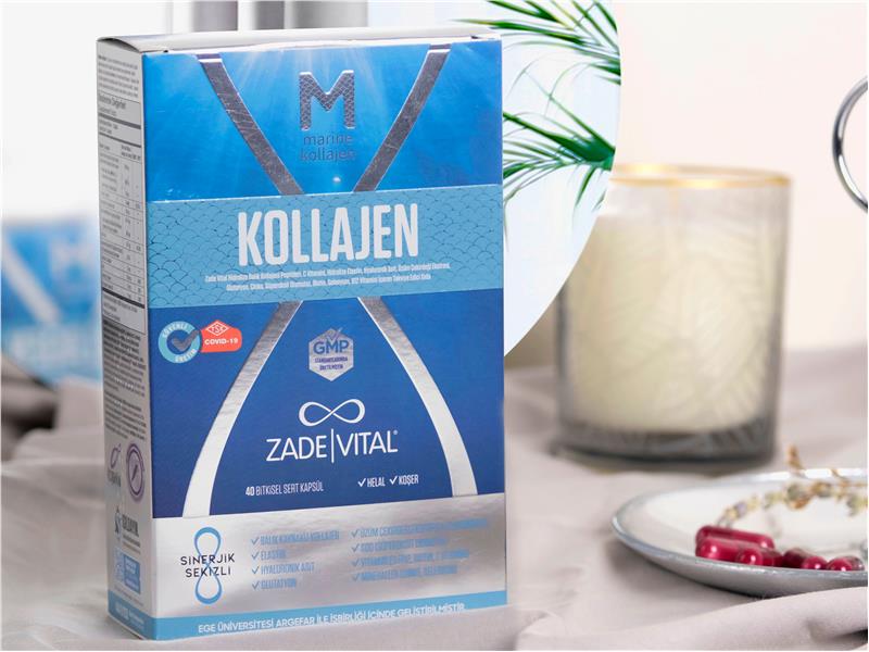Çevresel hasarlarla ve yaşla birlikte ciltteki kollajen miktarı azalıyor. Cilt daha kuru, esnek olmayan, matlık ve kırışıklıkların oluşmaya başladığı bir sürece giriyor. Zade Vital balık kaynaklı Marine Kollajen, cildin temel yapısını oluşturan Tip 1 kollajeni daha fazla içeriyor. Ayrıca, cildi içerden destekleyen içerikleri “Sinerjik Sekizli” ile zamanla azalan ve yapısı bozulan kollajeni yerine koymaya yardımcı oluyor. Elastin, hyaluronik asit, üzüm çekirdeği ekstresi, kavundan elde edilen süperoksit dismutaz, çinko, biotin ve C vitamininin etkisiyle cilt sağlığının korunmasında çok yönlü bir destek sağlıyor. Etkinlikleri klinik olarak kanıtlanmış patentli içeriklerden oluşan Zade Vital Marine Kollajen, zengin form seçeneği ile farklı yaş gruplarına hitap ediyor.