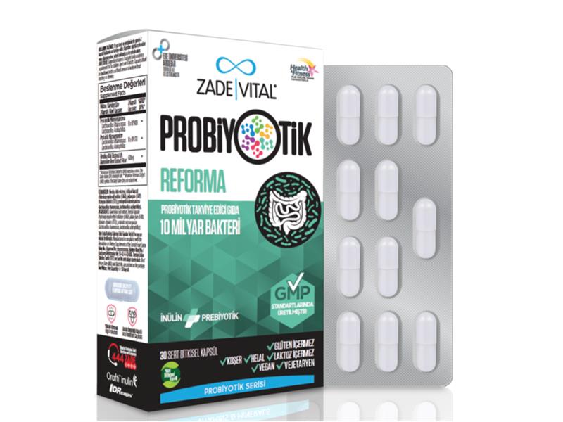Zade Vital Probiyotik Reforma, seyahat boyunca, bağırsak florasının temel dost bakterileri ile yanınızda. Zade Vital Probiyotik Reforma, formülünde bulunan probiyotik mikroorganizmalar sayesinde bağırsak florasını düzenlemeye ve bağışıklık sistemini desteklemeye yardımcı oluyor. Ayrıca içerdiği prebiyotik bileşenler, probiyotik mikroorganizmaların bağırsakta gelişimini ve yaşamını destekliyor. Zade Vital Probiyotik Reforma, gecikmiş salınım sağlayan özel kapsülü ile dost bakterileri bağırsağa ulaşıncaya kadar koruma altına alıyor. Klinik olarak kanıtlanmış etkinlik ve güvenliliğe sahip olan ürün, seyahatlerinizde değişen beslenme alışkanlıklarınızın, bağırsak florasına olumsuz etkilerini azaltmaya yardımcı oluyor.