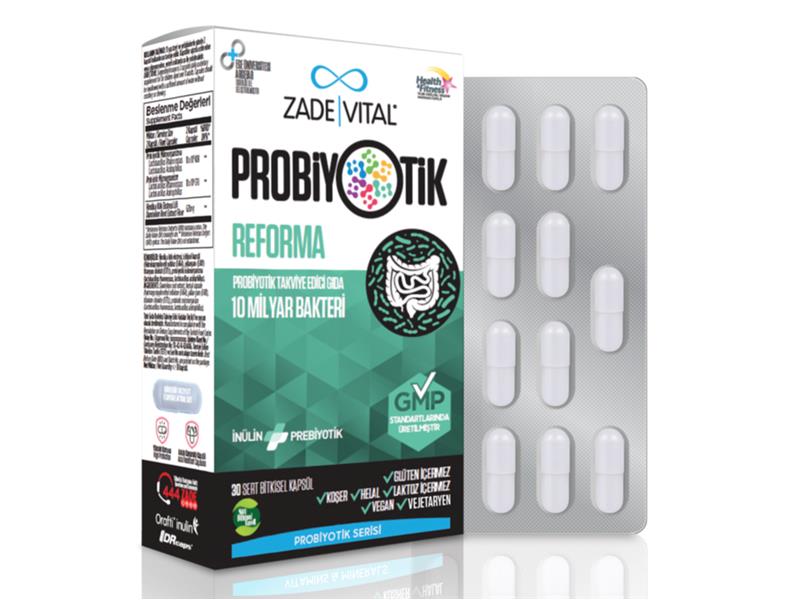 Zade Vital Probiyotik Reforma, formülünde bulunan probiyotik mikroorganizmalar sayesinde bağırsak florasını düzenlemeye ve bağışıklık sistemini desteklemeye yardımcı oluyor. Ayrıca içerdiği prebiyotik bileşenler, probiyotik mikroorganizmaların bağırsakta gelişimini ve yaşamını destekliyor. Zade Vital Probiyotik Reforma, gecikmiş salınım sağlayan özel kapsülü ile dost bakterileri bağırsağa ulaşıncaya kadar koruma altına alıyor. Klinik olarak kanıtlanmış etkinlik ve güvenliliğe sahip olan ürün, seyahatlerinizde değişen beslenme alışkanlıklarınızın, bağırsak florasına olumsuz etkilerini azaltmaya yardımcı oluyor.