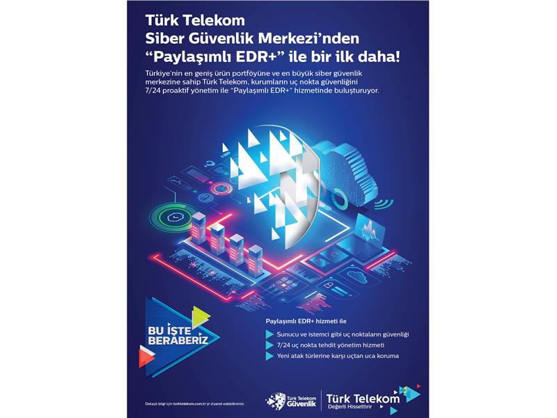 Türk Telekom, her geçen gün değişen siber atak türlerine karşı geleneksel güvenlik önlemlerinin fark edemediği tehditleri algılayan ve sistemdeki olağan dışı hareketleri analiz eden Paylaşımlı EDR+ servisi ile ‘Yeni Nesil Uç Nokta Güvenliği’ni hayata geçirdi. Türk Telekom, kurumlara ait sistemlerin giriş noktalarının güvenliğini sağlayan EDR (Uç nokta Tehdit Algılama ve Yanıt) ve MDR (Yönetilen Tespit ve Müdahale) teknolojilerini bir arada sunarak, uluslararası sertifikalara sahip alanında uzman mühendisleriyle 7/24 siber güvenlik koruma hizmetini uçtan uca sunuyor.