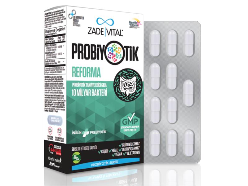 Zade Vital Probiyotik Reforma, formülünde bulunan probiyotik mikroorganizmalar sayesinde bağırsak florasını düzenlemeye ve bağışıklık sistemini desteklemeye yardımcı oluyor. Ayrıca içerdiği prebiyotik bileşenler, probiyotik mikroorganizmaların bağırsakta gelişimini ve yaşamını destekliyor. Zade Vital Probiyotik Reforma, gecikmiş salınım sağlayan özel kapsülü ile dost bakterileri bağırsağa ulaşıncaya kadar koruma altına alıyor. Klinik olarak kanıtlanmış etkinlik ve güvenliliğe sahip olan ürün, seyahatlerinizde değişen beslenme alışkanlıklarınızın, bağırsak florasına olumsuz etkilerini azaltmaya yardımcı oluyor.