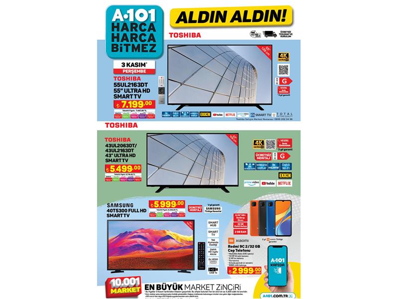 Bir diğer kaliteli seyir zevki sunan 4K Ultra HD televizyon ise TOSHIBA 43UL2063DT/43UL2163DT 43” Ultra HD Smart TV. Dâhili Wİ-Fİ, 3 adet HDMI, 2 adet USB media player girişi, wireless display özelliklerinin yanında Youtube, Netflix, Exxen ve Prime Video uygulamalarına kolay erişimi bulunmaktadır. 3 yıllık Vestel garantisi ve ücretsiz montaj imkânı ile sadece 5.499 TL fiyatıyla tüm A101 marketlerinde ve a101.com.tr’de satışa sunuluyor.