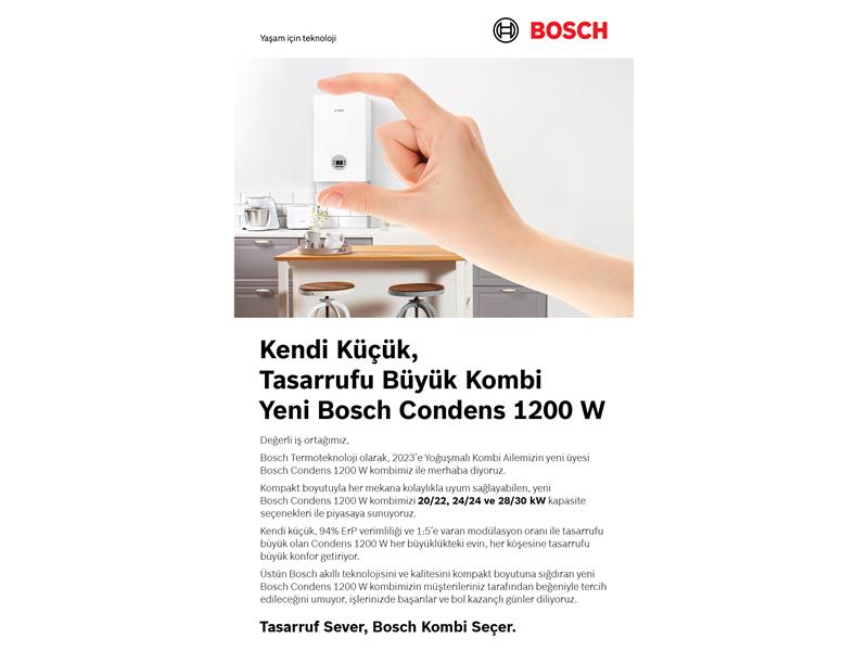 İklimlendirme sektörünün öncü firmalarından Bosch Termoteknik, 2023 yılına 3 farklı kapasite seçeneğiyle kullanıcıların değişen ihtiyaçlarına çözüm sunan yeni yoğuşmalı kombisi Condens 1200W ile ‘merhaba’ dedi. Yüksek verimliliği, geniş modülasyon aralığı ve sessiz çalışmasıyla sınıfının iddialı cihazlarından biri olan Condens 1200W, aynı zamanda kompakt ve şık tasarımıyla dikkat çekiyor.