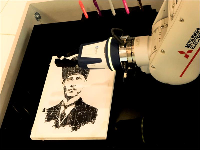 Mitsubishi Electric kolaboratif robotu Melfa Assista’nın yapay zekâ ile oluşturduğu Cumhuriyet’in 100. Yılı temalı resimler ziyaretçilerden büyük ilgi gördü.