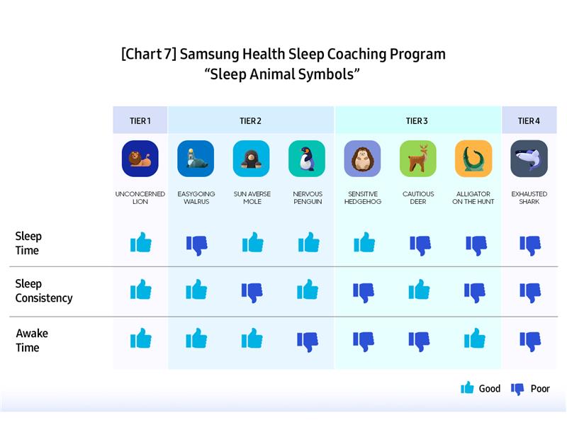 Samsung, Uyku Koçluğu etkinliğini takip etmek birçok kullanıcının koçluk hizmetiyle daha yüksek Uyku Hayvanı Sembolü seviyesine geçtiğini gördü. Örneğin, 3’üncü seviyedeki "Avdaki Timsah" iseniz, 1. veya 2. seviyedeki daha yüksek bir Uyku Hayvanı Sembolü’ne geçtiğinizde, alınan koçluk hizmetinin etkili olduğu düşünülüyor. Sonuçlara bakıldığında, uyku koçluğunun gerçekten işe yaradığı görülüyor. Daha iyi uyku alışkanlıkları edinmenin bir sonucu olarak Uyku Hayvanı Sembolü’yle eşleşmenin olumlu yönde evrimleşmesi, Uyku Koçluğunun etkili olduğunu gösteriyor.