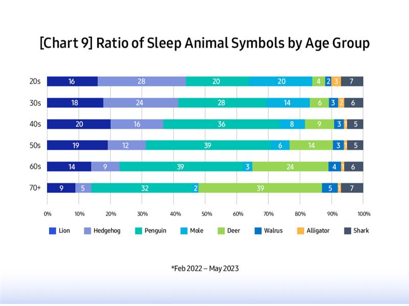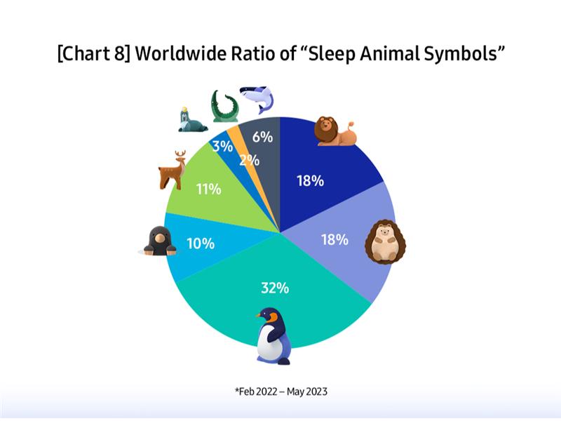 Samsung, dünya çapında yaygın görülen uyku düzenleri hakkında daha derinlemesine bilgi edinmek amacıyla, farklı uyku tiplerinin analizini yaparken bunları Uyku Hayvanı Sembolü’yle[4] kategorize ediyor. Sekiz Uyku Hayvanı Sembolü’nün her biri, uyku süresi, tutarlılığı ve uyanık kalma süresi gibi toplu olarak uyku kalitesini etkileyen benzersiz özelliklere sahip farklı uyku düzenini temsil ediyor.