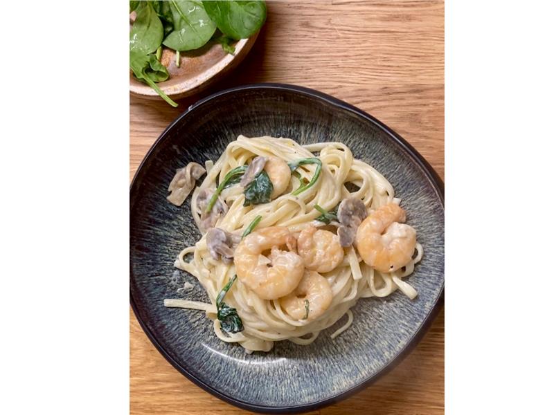 Makarnanızı pişirme talimatlarına göre pişirin ve süzün, suyundan 1 kap ayırın. Bir tavanın içinde biraz tereyağı ile soğanları kavurun, sarımsağı ekleyin iyice kavurun, buzunu çözdürdüğünüz karidesleri ekleyin, ıspanakları ve mantarları ekleyin. 5 dakika pişirin. Biraz makarna suyundan ekleyin. Suyunu çekince kremayı ekleyin. Limon suyu ve limon kabuğunu ekleyin. Ocaktan alın. Makarnayı karıştırın ve tabağa alın, üzerini rende peynir ve yeşillikler ile süsleyin. Afiyet olsun!