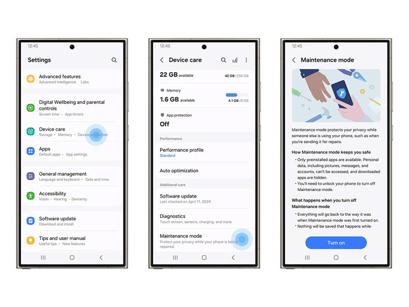 Samsung'un Bakım Modu bu noktada devreye giriyor[1]. Bu mod, cihazınız elinizden çıkıp herhangi bir onarım için gönderildiğinde kişisel verilerinizi korumak ve bunlara erişilmesini engellemek için özel olarak geliştirildi. Bakım Modunu etkinleştirdiğinizde, farklı bir kullanıcı profili oluşturarak birincil hesabınızın ve verilerinizin gizli kalmasını sağlayabilirsiniz. Bu özellik, Bakım Modu'na girip modu seçmeden önce Cihaz Bakımına dokunduğunuz cihazın Ayarlar kısmından ya da Samsung Members uygulaması aracılığıyla etkinleştirilebiliyor.