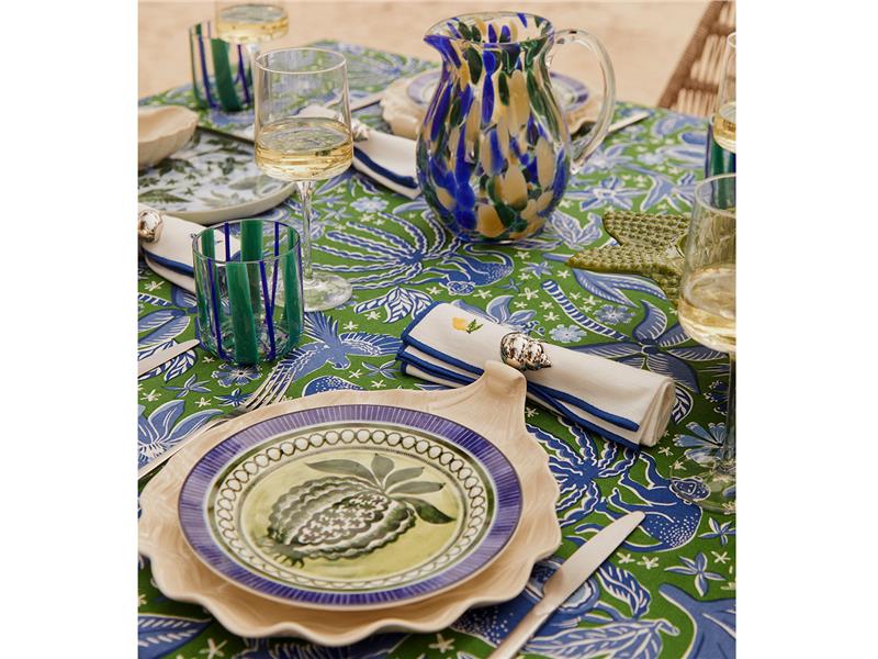 Yemek alanında ise palmiye desenli tabaklar, servis kaseleri ve bardak altlıklarıyla yazın keyfini çıkarın. Yeşil ve mavi renklerin harmanlandığı bu desenler, sofranıza tropikal bir hava katıyor.