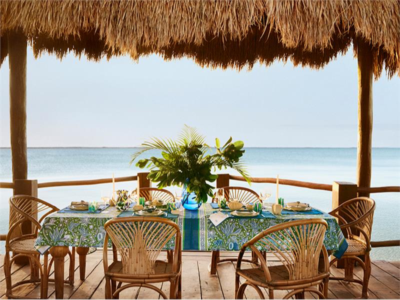 • Dekoratif yemek keyfi: Palmiye desenli servis kaseleri, tabaklar ve bardak altlıkları ile yaz sofralarınızı süsleyin.