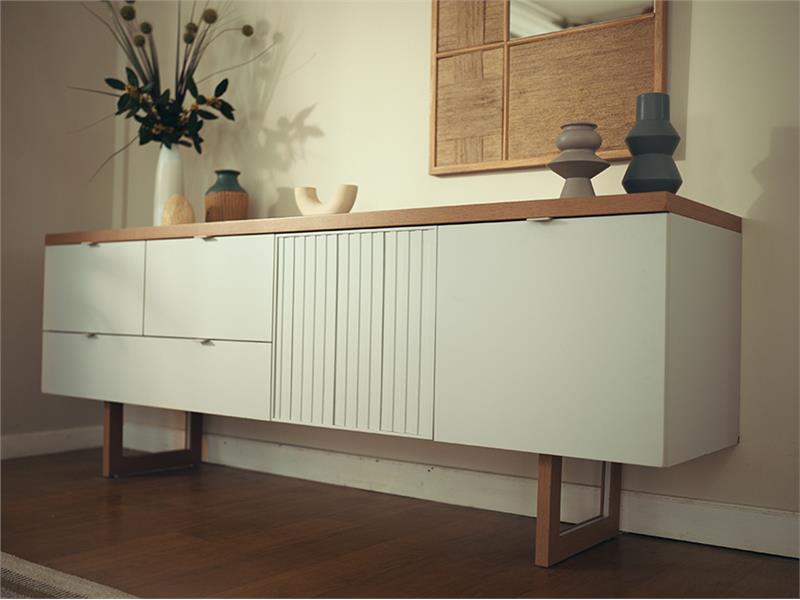 Dolap ve çekmecenin bir arada kullanıldığı konsol tasarımı ve konsola derinlik katan işçilikli üst tabla ile uyumlu çıtalı kapak tasarımı serinin bütünlüğünü yansıtırken fonksiyonelliği ve estetiği bir arada sunuyor. Akdeniz stili ile uyumlu çizgilere sahip jüt ipli özel ayna tasarımı ise açık tonlardaki yemek odası takımına eşlik ediyor.