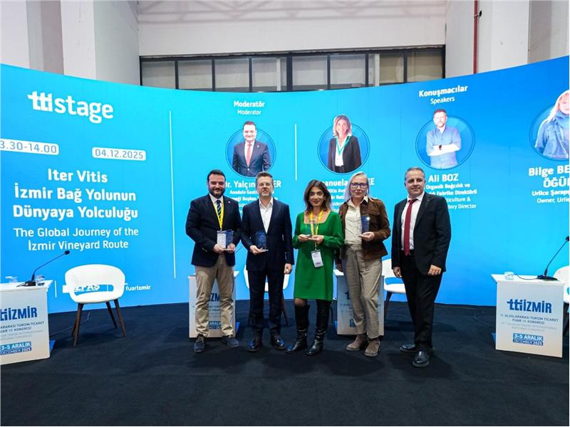 Fuar kapsamında gerçekleştirilen “ITER VITIS-İzmir Bağ Yolunun Dünyaya Yolculuğu” başlıklı oturumda ise bağcılık mirasının uluslararası kültür rotaları içindeki yerini odağına aldı. Anadolu Gastronomi Turizmi Derneği’nden Yalçın Güçer’in moderatörlüğünde düzenlenen oturumda; Iter Vitis Avrupa Konseyi Kültür Rotası Başkanı Emanuela Panke, LA Organik Bağcılık ve Şarapçılık Fabrika Direktörü Ali Boz ile Urlice Şarapçılık Sahibi Bilge Bengisu Öğünlü konuşmacı olarak yer aldı. Oturumda, İzmir Bağ Yolu’nun Avrupa Konseyi tarafından tescillenen Iter Vitis Kültür Rotası ağı içerisine de alındığı hatırlatılarak, stratejik konumu, sürdürülebilir bağcılık uygulamaları, şarap turizminin gelişimi ve yerel ekonomiye sağladığı katkılar kapsamlı biçimde konuşuldu. Oturumda; binlerce yıllık bağcılık geçmişiyle Anadolu’nun önemli üretim merkezlerinden biri olan İzmir’in, kültür rotaları aracılığıyla uluslararası turizm ağlarına daha güçlü entegre olma potansiyeline sahip olduğu vurgulandı. Konuşmacılar, İzmir Bağ Yolu’nun, yalnızca bir turizm destinasyonu değil aynı zamanda gastronomi, kültür, kırsal kalkınma ve sürdürülebilir turizmi bir araya getiren bütüncül bir deneyim rotası sunduğuna dikkat çekti.