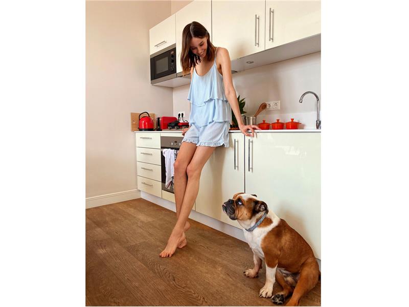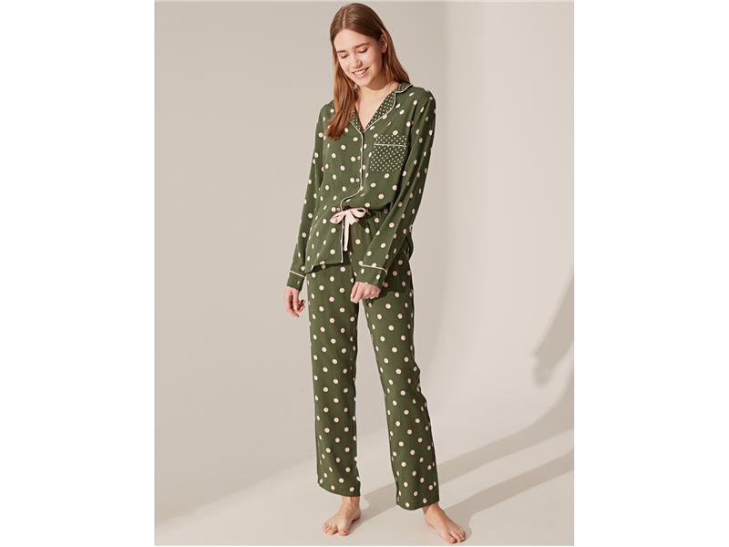 Yeşil, lacivert, soft pembe, beyaz ve sarının yoğunlukta olduğu renk paletiyle baskılı, çiçekli ve puantiye desenlerin yer aldığı Kadın Pijama koleksiyonunda kollar ve şortlarda yer alan fırfırlar, v yakalı şık gömlek yaka tasarımlarının yanı sıra uzun ve kısa elbise gecelikler yer alıyor.