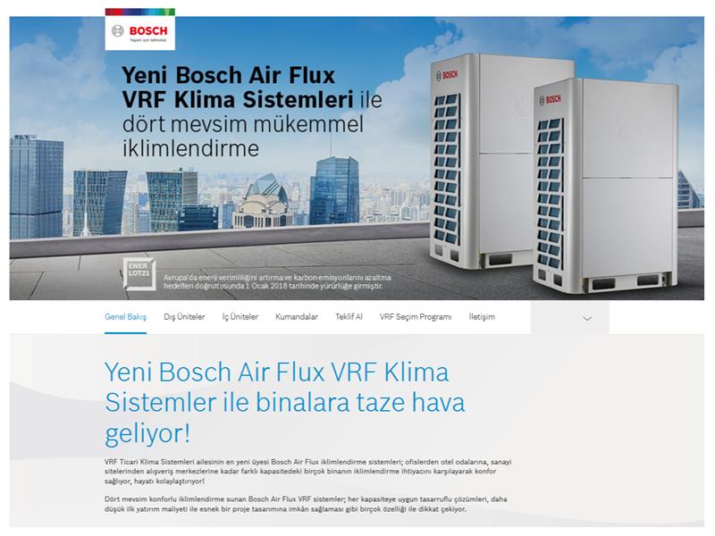 Hayatı kolaylaştıran teknolojiler sunan Bosch Termoteknoloji, Nisan ayında pazara sunduğu yeni ürünü Bosch Air Flux VRF ticari klima sistemleri için yeni web sitesi www.boschairfluxvrf.com’ u hayata geçirdi.