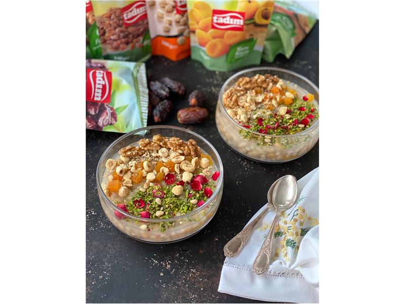 Birbirinden lezzetli ve pratik yemek tarifleriyle ilgiyle takip edilen şef Çiğdem Seferoğlu, Tadım’ın hijyenik ambalajlarda ilk günkü tazeliğini koruyan kuru meyve ve kuru yemişleriyle hem sağlıklı hem de lezzetli 2 farklı aşure tarifi hazırladı. Ünlü şef, klasik aşure tarifinin yanı sıra şeker kullanmak istemeyen aşure severler için şeker yerine en çok kullanılan kuru meyve olan hurma ile yapılan “hurmalı & portakallı” aşure tarifi verdi.