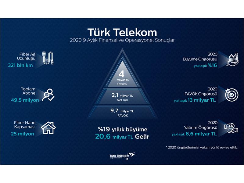 Önal, “2020’nin 3. çeyrek performansını başarıyla geride bıraktık. Üçüncü çeyrekte de çekirdek şebekemiz üzerine yüklenen ilave yoğun trafikle artan iletişim talebinin üstesinden gelerek kesintisiz iletişimi devam ettirdik. Ülkenin her bir köşesine ulaşan güçlü fiber ağımızı 321 bin kilometre uzunluğa çıkardık. Fiberdeki lider pozisyonumuzu 5G ve dijital teknolojilere aktararak bu yolculukta Türkiye’yi öncü yapmaya kararlıyız” diye ifade etti.