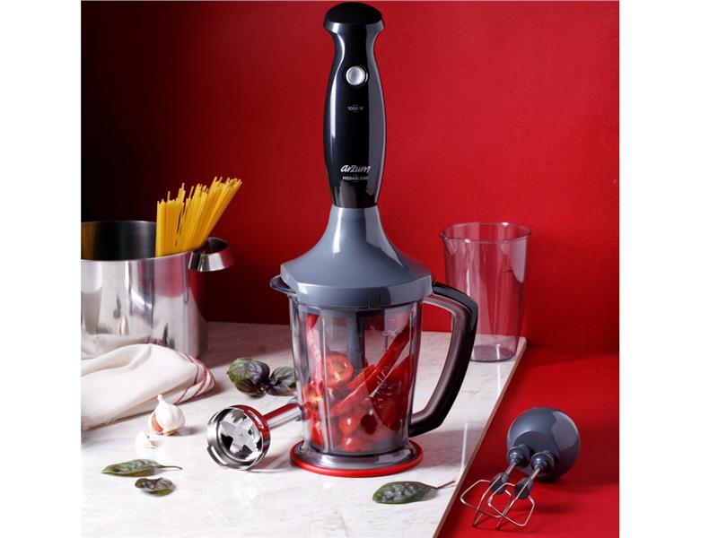 1500 ml büyük doğrayıcı haznesi sayesinde büyük porsiyonları kolayca hazırlamanızı sağlayan mutfaktaki yardımcınız Megablend, paslanmaz çelik, çift katlı ve çift taraflı bıçaklarıyla et, sebze, soğan, meyve, fındık gibi yiyecekleri hızlı bir şekilde parçalamanıza olanak veriyor. 1000W motor gücü ve tırtıklı 4 bıçaklı el blenderı ile de sert yiyecekleri bile kısa sürede homojen bir kıvama getirebiliyorsunuz.