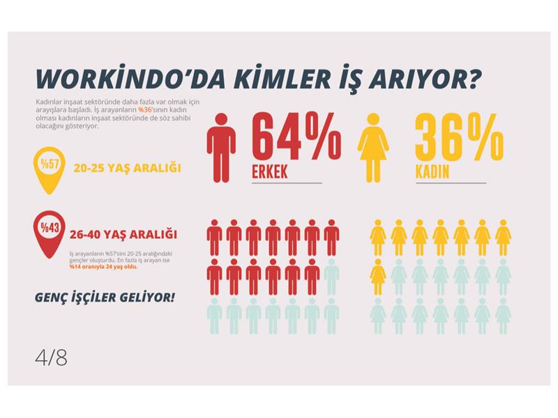 Kadınlar inşaat sektöründe daha fazla var olmak için arayışlara başladı. İş arayanların %36’sının kadın olması kadınların inşaat sektöründe ciddi varlığını gösteriyor. Workindo.com’da iş arayanların %57’sini 20-25 yaş aralığındaki gençler oluşturuyor. 26-40 yaş aralığı ise %43. En fazla iş arayan yaş ise %14 oranıyla 24 oldu.